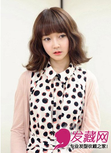 发型点评:齐刘海是萌妹的最爱刘海之一。蓬松的棕色蛋卷头打造出慵懒随性的感觉,发束沿着脸颊内扣,呆萌的样子人见人爱。