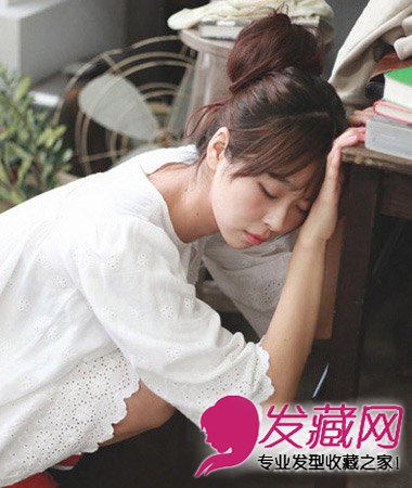 小清新范儿花苞头长发扎法,圆润感的花苞头盘发很适合发量多的MM打理,加染红棕色染发甜美显白皙。