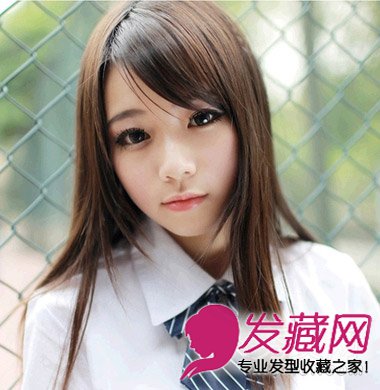 韩流范儿斜刘海披肩发,薄透的刘海发丝轻盈,直发打薄更显清新利落,搭配棕色挑染发,最显肤白的校园女生发型。