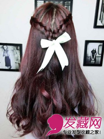 亮眼的深酒红色染发也是妹纸们偏爱的一款挑染发色,蓬松的烫卷长发扎公主头发型,编发搭配蝴蝶结发饰,浪漫清新。