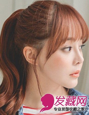 甜美的卷发马尾发型很轻松的打造出别致的气质感,不仅简单而且个性十足,时尚的红棕色染发显露出别致的时尚感,内扣的刘海显露出甜美的一面。