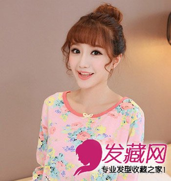 秋季披散着头发特别容易起静电,不防扎上这样一个同样甜美又显活力感的丸子头发型,配合时尚的棕橘色染发与清新的空气感刘海,两则的卷发长刘海造型更显女生的清新甜美风。