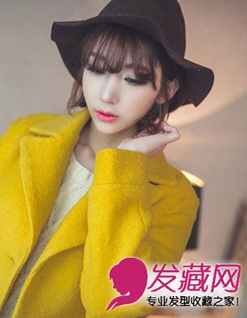 很简单的一款短发发型,甜美的红唇搭配上时尚的空气刘海显露出别致的时尚感。搭配上帽子更显气质感。