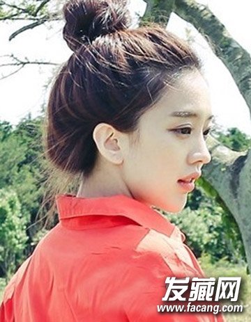 红色的衬衫与清爽的丸子头搭配起来显得无比时尚而且颇有气质感的一面哦,清爽的露额发型 勾勒出蓬松与气质来。