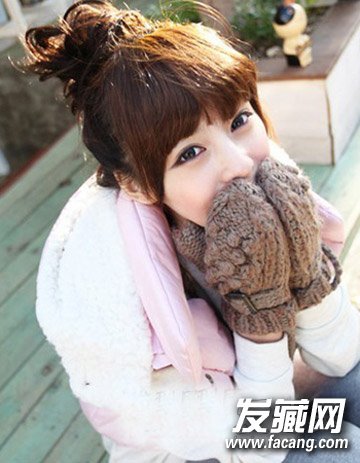将丸子头扯松散一些最好,甜美的内扣 刘海显露出灵动与气质的一面来,可爱的韩式丸子头时尚大方。