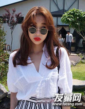 一求救个性感十足的时尚女生修颜烫发发型,采用的是浅栗色的染发颜色,再搭配中分形式的卷发刘海与内扣形式扣长发烫发修颜更添女生上潮流街拍范儿。