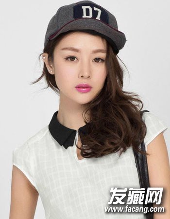 利用的是清爽的露额发型设计来衬托出韩国女生脸型的精致感,侧边丰盈的韩式中长发烫发与一顶简单的帽子相搭更添十足的青春活力感。