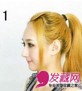 步骤一:在前额(刘海区)的斜侧留一缕比较长的头发,把其它头发全部绑起来梳成利落的高马尾辫。