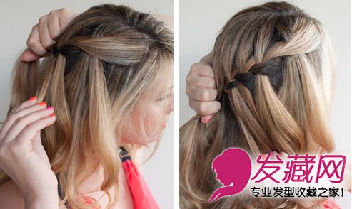 step3:并入下方新的发束,再将其中一束头发也从交叉结点垂下。