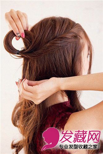 1、将左右耳朵上方的头发拧转后绑在脑后,并将留取的发梢从发结内穿过。