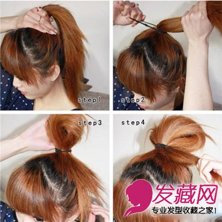STEP1 先将头发绑成一个高高的马尾。不要将所有的头发都拿出来,留一部分,发丝的方向朝向后脑勺。