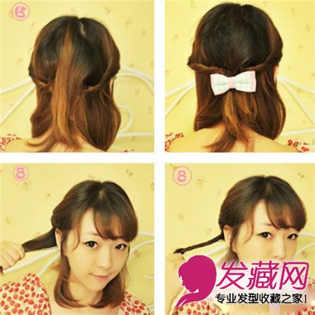 STEP3 另一边重复同样的动作即可,也将小辫子固定在脑后,从头顶上取一束头发放在以固定好的辫子上方。在这里可以将那一束头发与之前的小辫子绑在一起,然后加上蝴蝶结形发夹也很漂亮哦。再从以固定好头发的下方拿出一小束头发。用手指进行旋转将之编成辫子。