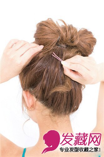 把分成2部分的圆圈的下侧分别用发卡固定。如果有浮起的话再多加一个发卡固定。