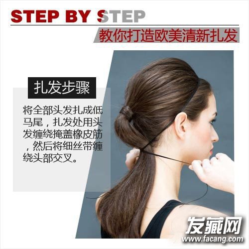 step 2:将全部头发扎成低马尾,扎发处用头发缠绕掩盖橡皮筋,然后将细丝带缠绕头部交叉。