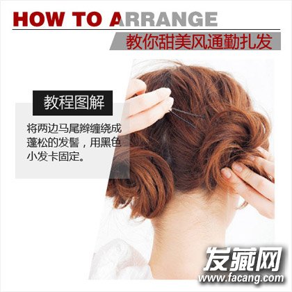 step 2:将两边马尾辫缠绕成蓬松的发髻,用黑色小发卡固定。