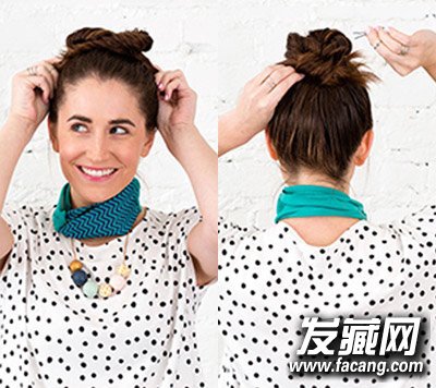 step8:最后将两束扭卷的头发如图汇合在一起,用发夹固定起来。