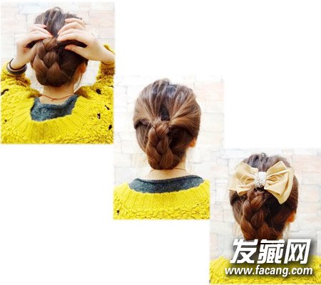 5、或者是将编好的辫子直接向上卷,扎在之前马尾的扎发处,发根藏在里面,带上发饰就完成了,感觉和蜈蚣辫差不多呢!