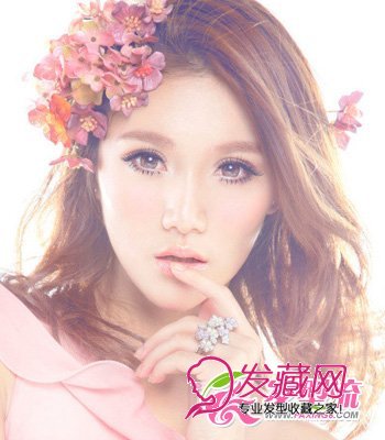 如果你有精致的脸型不妨显露出来吧!将3/7分的刘海一直延伸至耳际。将由小花朵组合而成的头饰装饰在头发上,让造型更加甜美、浪漫。发尾的外翘卷曲弧度,令发型绽放最美丽的姿态,气质更加迷人。