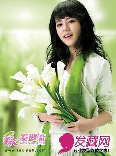 这款发型给人清新自然的感觉,拥有这样一款卷发发型整个夏季都觉得清爽舒适。厚重的斜刘海拨到左边,柔顺的发丝轻盈十足,发梢微微外翘,整个方向与身上的着装,手里的百合花相融合,清新洒脱的形象脱颖而出。