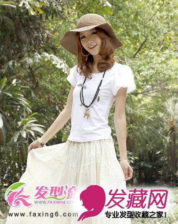 这款发型配合着大边帽子给人一种海边风的感觉,很好的修饰了女生的脸型,栗色的发丝呈堆叠内卷轻落两肩,一副大大的耳环为最新流行的卷发发型加了分,喜欢这款发型的MM们可以试一下哦!