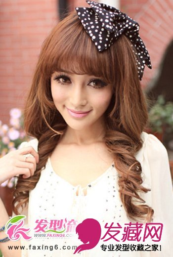 同样是一款螺旋卷的卷发造型,加染上板栗色的发色,展现出女生的性感稳重气质,内卷齐刘海的女生发型,一双柳眉若隐若现,凸显出了灵气有神的眼睛,蝴蝶结发饰的搭配,一展甜美可爱气质。