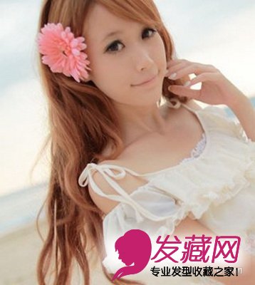 长卷发总给人很优雅浪漫的感觉,长卷发发型随风摇曳出浪漫的气息,金棕色的染发颜色,令卷发发型更富浪漫时尚的气质,斜刘海发型别上一个花朵发饰,十分的风情迷人。