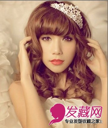 刚好过肩长度的中长卷发,将卷发做出内卷的形状,有很好的修饰脸型的效果,内卷弧度的刘海发型,让发型显得更加独特,别上一个皇冠发饰,有着公主般的魅力。