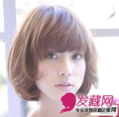 齐刘海微卷发发型,甜美可爱的波波头短发造型,只在发尾做出内扣的卷度,包裹着脸颊,起到收敛下巴作用,加上内扣齐刘海,修颜瘦脸效果一流。