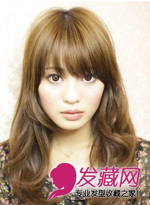 中长发卷发发型,轻盈齐刘海带给人清爽感觉,突出浓眉大眼,两侧蓬松的卷发遮住颧骨修饰出鹅蛋脸型,耳际处下烫成大卷,显得格外优雅,亚麻色的染发有种低调的时尚。