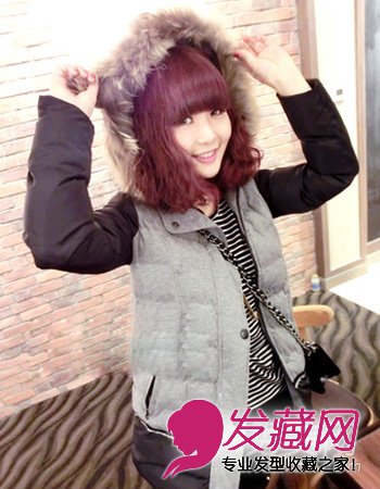 酒红色系的染发,时尚潮流,又能凸显红润白皙皮肤,齐刘海的蛋卷头,粉嫩减龄,同时又展现了青春洋溢味道