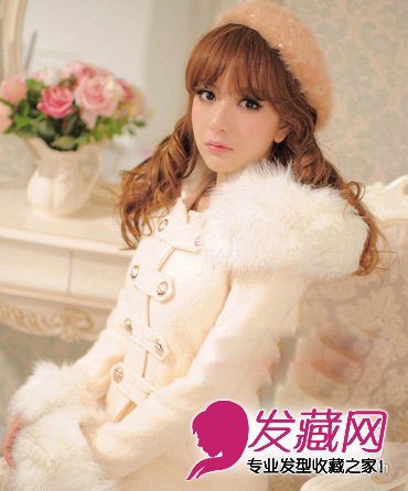 粉嫩的妆容非常迷人,时尚洋气的浅棕色卷发,加贝雷帽与毛领呢大衣搭配淑女味十足。