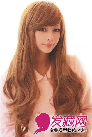 斜分的刘海显得脸型更加精致小巧,加上大眼妆更是萌系十足,及腰的浓密长发烫上简单的大卷,很像漫画中甜美可爱的少女形象
