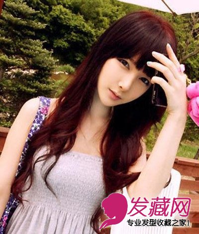 薄薄的齐刘海清新舒适,齐腰的长发从肩膀处烫上简单的大卷,更添一丝小女孩的精致甜美,酒红色的发色在沉闷冬季会非常吸人眼球