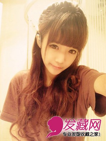 齐刘海的长卷发发型,真的是超级可爱的呢!把一部分的卷发半扎起来,露出耳朵和干净的脸颊。是一款非常甜美的卷发造型。