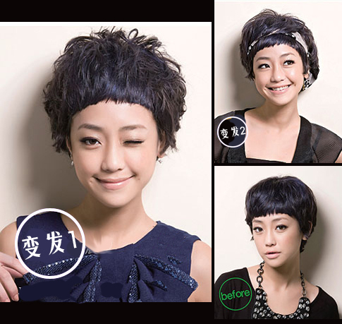 极短发加上超短刘海 ,既摩登又不失女生感,以蓝色细线条挑染和弹性烫制造发束感,让短发更有型,低调蓝色染发 即使在日常生活中也不显怪异。Joe特别建议,该发型很适合现代感的打扮,展现时尚味。这款短发除了圆形脸外,其他脸型都很适合。