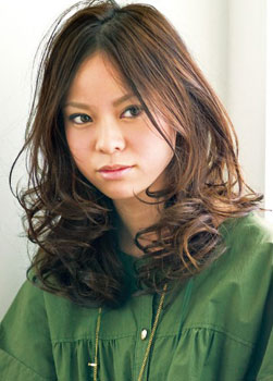 同样是从中分开始,亮出光洁的额头。带有鲜亮的发色的大发卷团团包围住脸蛋,形成了小脸效果。大大的发卷与上部稍显平整贴实的发丝形成对比,更凸显了整个发式的立体感。