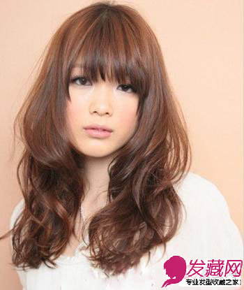 齐刘海的长卷发给人感觉非常甜美可爱,蓬松的设计效果非常有心机,将整个头型显得十分饱满,同时也具有很好修颜功效。加上棕红色的发色,更是突显白皙的肌肤,给人感觉非常年轻有活力。