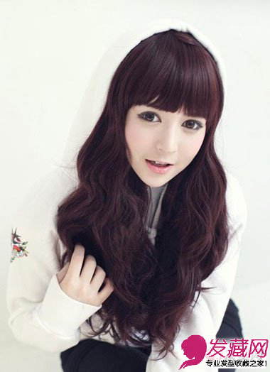 齐刘海显得很有厚重感,给人感觉非常饱满个性。酒红色的发色提亮肤色的同时彰显出女生的潮流时尚感,加上长长的大卷发,非常有造型感,整体给人感觉非常甜美浪漫。