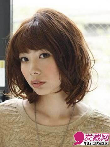 这一款卷发造型适合任何脸型的女生,带着卷度的齐刘海非常好的拉长了脸型比例。蓬松自然的卷发柔化了脸部线条,将女生的柔美尽情展现出来。棕色的发色非常显年轻,减龄必备哦!