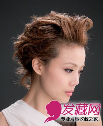 中卷发也可以盘成女人味发髻,将所有头发打造出微卷的发卷,然后梳到脑后,额前的刘海则造型出自然凌乱的感觉,整个发型都充满着随性地性感味道