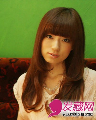 齐齐厚厚的刘海,加上内扣,盖过眉毛,使眼睛更大了。这款造型特色在两边头发有一撮比其他短,向内扣,其他长长的,适度得卷曲,甜美可爱又有特色。