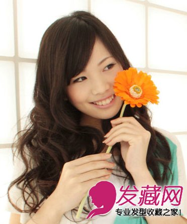 斜分的刘海,露出好看的眉毛,头发从脸颊开始大波浪向下卷,在发尾部分弄散,黑色使真个造型非常原始和清纯。也很好的修饰了脸型哦。