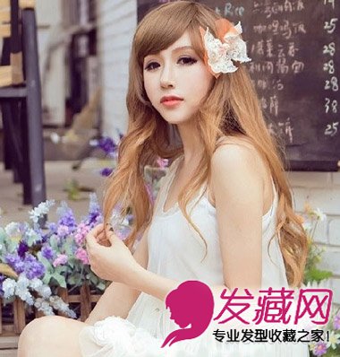 金棕色的长卷发发型,斜刘海设计甜美可爱,也十分清新靓丽,花朵头饰的点缀公主头很成功。