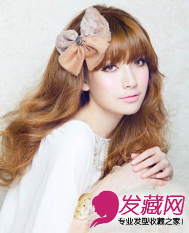 棕黄色染发颜色搭配蓬松的卷发发型,配上薄薄的齐刘海,好像洋娃娃般惹人怜爱,是一款很好的减龄发型呢!在一侧别上一个蝴蝶结的发饰更显甜美浪漫。