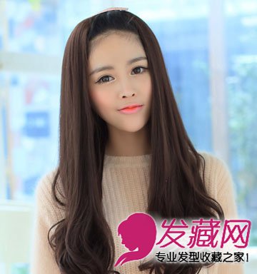 无刘海披肩长卷发,自然散落下来的长卷发很好的遮盖了脸上的肉肉,把刘海扎起来为了突出精致的五官,清新美丽。