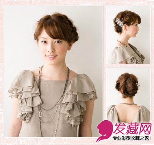 时尚长发扎发发型第九款: 这款长发扎发从正面看是短发效果,侧面是非常美丽精致的编辫,加上漂亮的发饰装饰非常优雅甜美,背面将常常的辫子向上固定在头顶,就形成了正面看起来利落干净的短发效果,很别出心裁哦。