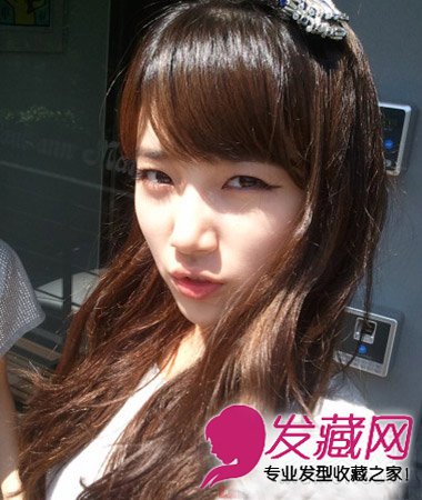 女生的卷发发型进行了层次感处理,营造出一股蓬松有型的效果,搭配修颜的韩式斜刘海设计,很好的展现出了女生精致的五官。