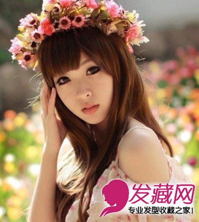 别一番浪漫迷人风情的美态,源自于这一款韩系的长卷发发型,碎分一角的刘海凸显魅惑大眼妆,头顶点缀上花环发饰,变身为气质花仙子感觉。