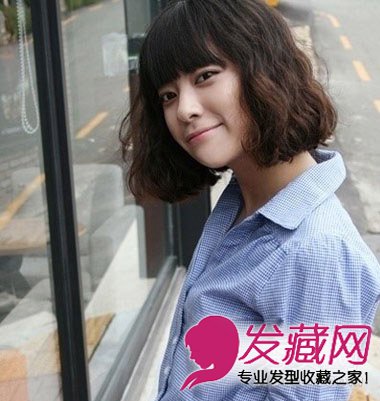 超可爱的栗米烫卷发,带点内弧的齐刘海,蓬松的栗米烫卷发轻松的修饰了小巧的脸蛋,甜美又可爱,回头率十足哦。