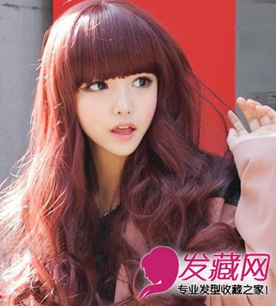 发型七,酒红色的大波浪卷,酒红色本就是一款时尚的颜色,大波浪和卷发更增添了不少的潮流感,而略有弧度的刘海又给人一种可爱的萌态。
